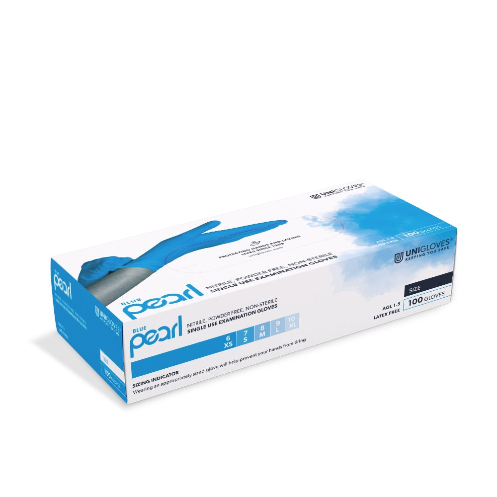 Nitrilhandschuhe Blue Pearl der Marke Unigloves, 10 Boxen im Karton, 100 Handschuhe in jeder Box, inklusive Versand